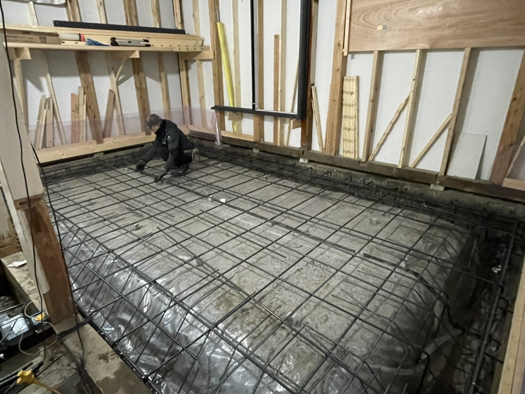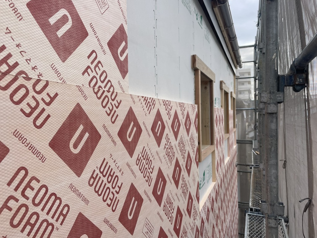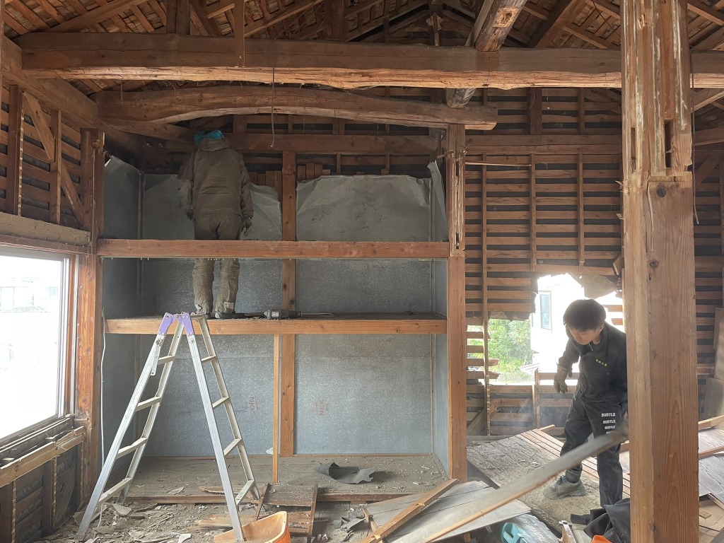 現在の現場の状況は、外壁や内装の仕上げ材を施工する一方で、断熱工事や構造の補強工事も並行して行っています。