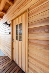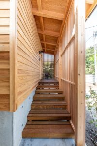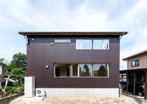 外観はファサードに新潟県産の杉板、その他の面をガルバニウム鋼板に。
